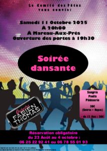 08 Sep SOIRÉE DANSANTE by Laurence in Comments Calendrier Ajouter au calendrier Ajouter au calendrier Timely Ajouter à Google Ajouter à Outlook Ajouter au calendrier Apple Ajouter à un autre calendrier Exporter vers XML Quand : 11 octobre 2025 @ 20 h 00 min 2025-10-11T20:00:00+01:00 2025-10-11T20:15:00+01:00 Où : salle polyvalente rue du Stade Contact : Comité des Fêtes 06.78.55.01.93 ou 06.25.22.92.41 E-mail Associations