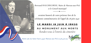 14 Juin CÉRÉMONIE COMMÉMORATIVE APPEL DU 08 JUIN 1940 by Laurence in Comments Calendrier Ajouter au calendrier Ajouter au calendrier Timely Ajouter à Google Ajouter à Outlook Ajouter au calendrier Apple Ajouter à un autre calendrier Exporter vers XML Quand : 18 juin 2024 @ 19 h 30 min – 20 h 30 min 2024-06-18T19:30:00+01:00 2024-06-18T20:30:00+01:00 Où : Cimetière Contact : mairie 02.38.45.61.09