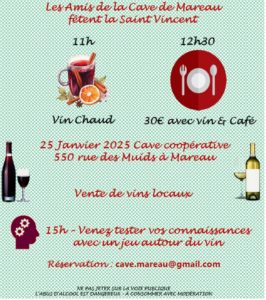 18 Déc FÊTE DE LA SAINT VINCENT by Laurence in Comments Calendrier Ajouter au calendrier Ajouter au calendrier Timely Ajouter à Google Ajouter à Outlook Ajouter au calendrier Apple Ajouter à un autre calendrier Exporter vers XML Quand : 25 janvier 2025 @ 11 h 00 min 2025-01-25T11:00:00+00:00 2025-01-25T11:15:00+00:00 Où : Cave coopérative 550 rue des Muids Contact : Les amis de la Cave de Mareau E-mail Festivités