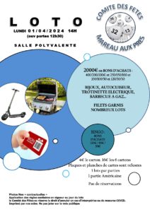 29 Mar LOTO COMITE DES FETES by Laurence in Comments Calendrier Ajouter au calendrier Ajouter au calendrier Timely Ajouter à Google Ajouter à Outlook Ajouter au calendrier Apple Ajouter à un autre calendrier Exporter vers XML Quand : 1 avril 2024 @ 14 h 00 min 2024-04-01T14:00:00+01:00 2024-04-01T14:15:00+01:00 Où : salle polyvalente Contact : Comité des Fêtes Associations