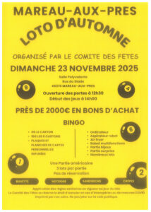 20 Jan LOTO by Laurence in Comments Calendrier Ajouter au calendrier Ajouter au calendrier Timely Ajouter à Google Ajouter à Outlook Ajouter au calendrier Apple Ajouter à un autre calendrier Exporter vers XML Quand : 23 novembre 2025 @ 14 h 00 min 2025-11-23T14:00:00+00:00 2025-11-23T14:15:00+00:00 Où : salle polyvalente Contact : Comité des Fêtes 06.15.07.09.20 E-mail Festivités