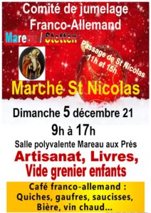 29 Nov MARCHÉ SAINT NICOLAS by Laurence in Comments Calendrier Ajouter au calendrier Ajouter au calendrier Timely Ajouter à Google Ajouter à Outlook Ajouter au calendrier Apple Ajouter à un autre calendrier Exporter vers XML Quand : 5 décembre 2021 @ 9 h 00 min – 17 h 00 min 2021-12-05T09:00:00+00:00 2021-12-05T17:00:00+00:00 Où : salle polyvalente Coût : Gratuit Contact : COMITÉ DE JUMELAGE 06 83 29 76 47 E-mail Associations